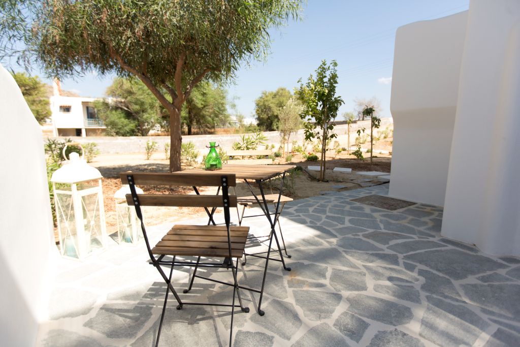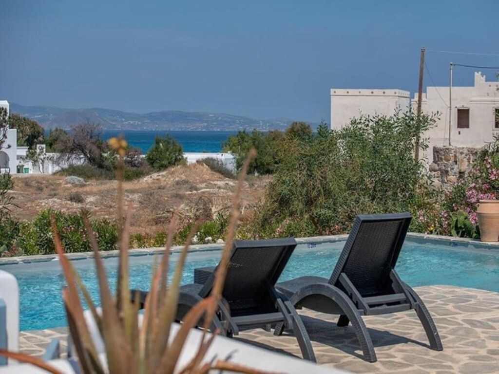 The villa features a private pool set within beautifully landscaped lawn and shrub gardens, with sun loungers for relaxing under the Naxos sun. Outdoor living spaces include a large dining table and comfortable seating, complemented by a outdoor kitchenette and gas BBQ, ideal for gatherings or leisurely meals.