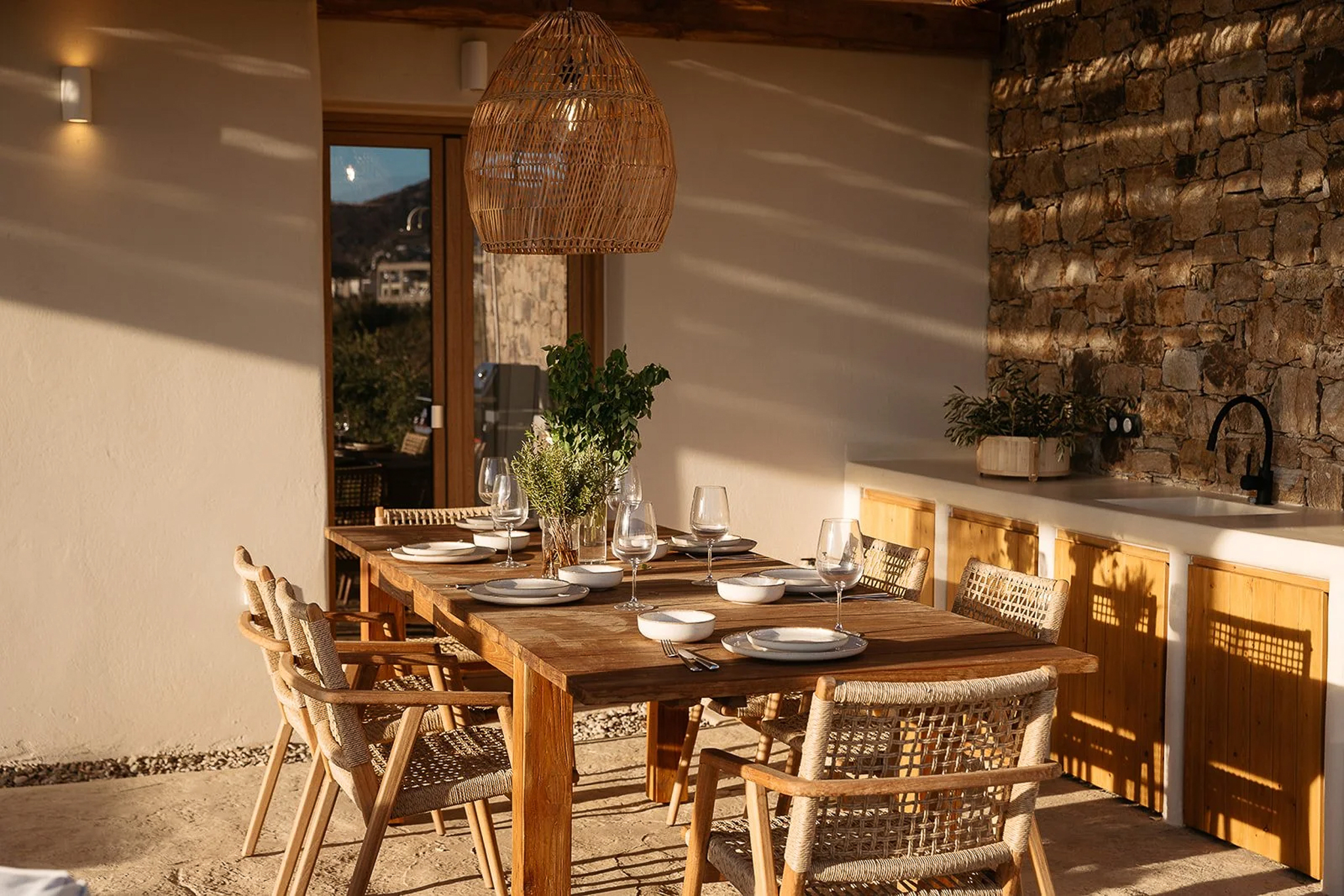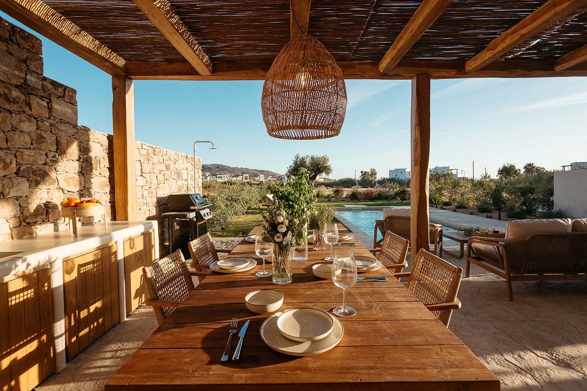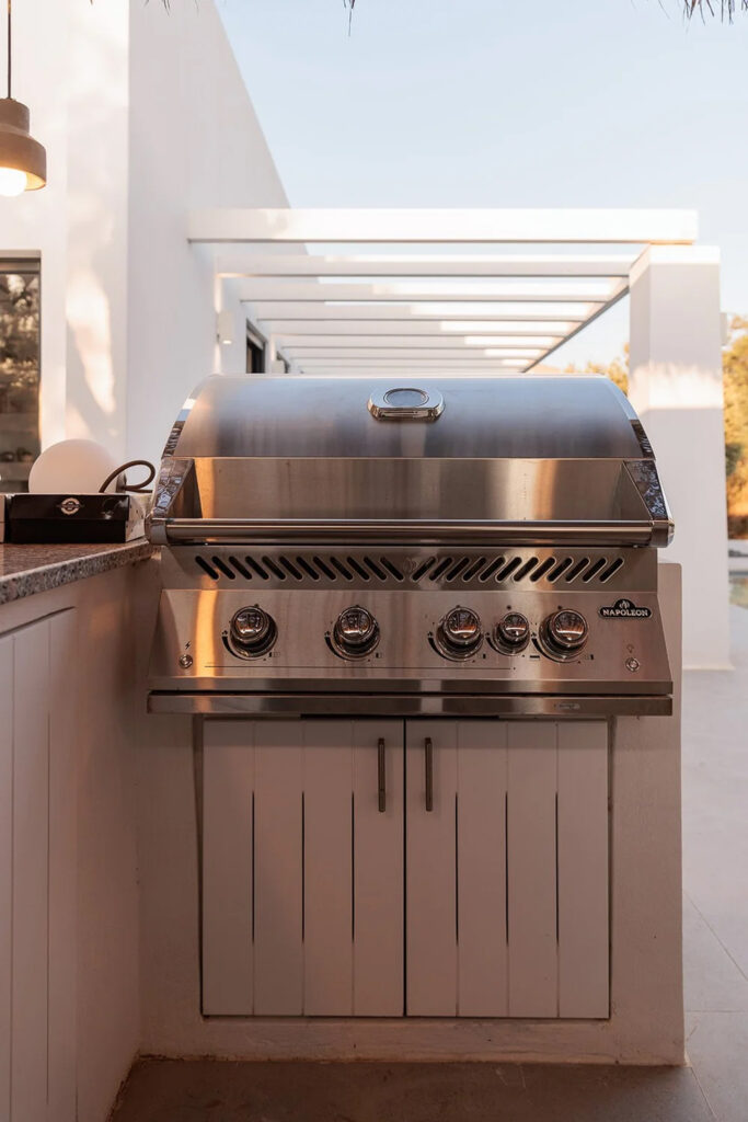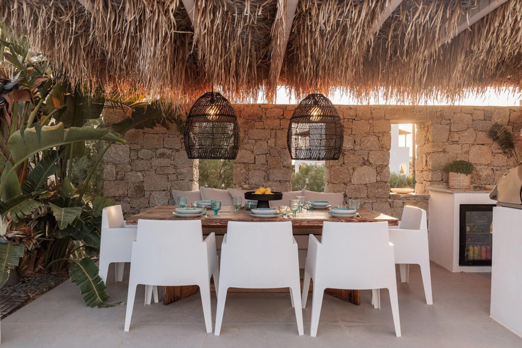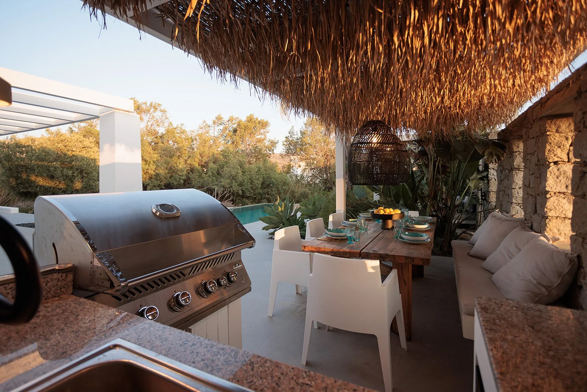 The outdoor area also includes a large outdoor dining area, a kitchenette, barbecue, and wine fridge, complemented by comfortable lounge seating. Every detail has been designed to create a serene and elegant setting, making the outdoor area one of the most captivating parts of the villa.