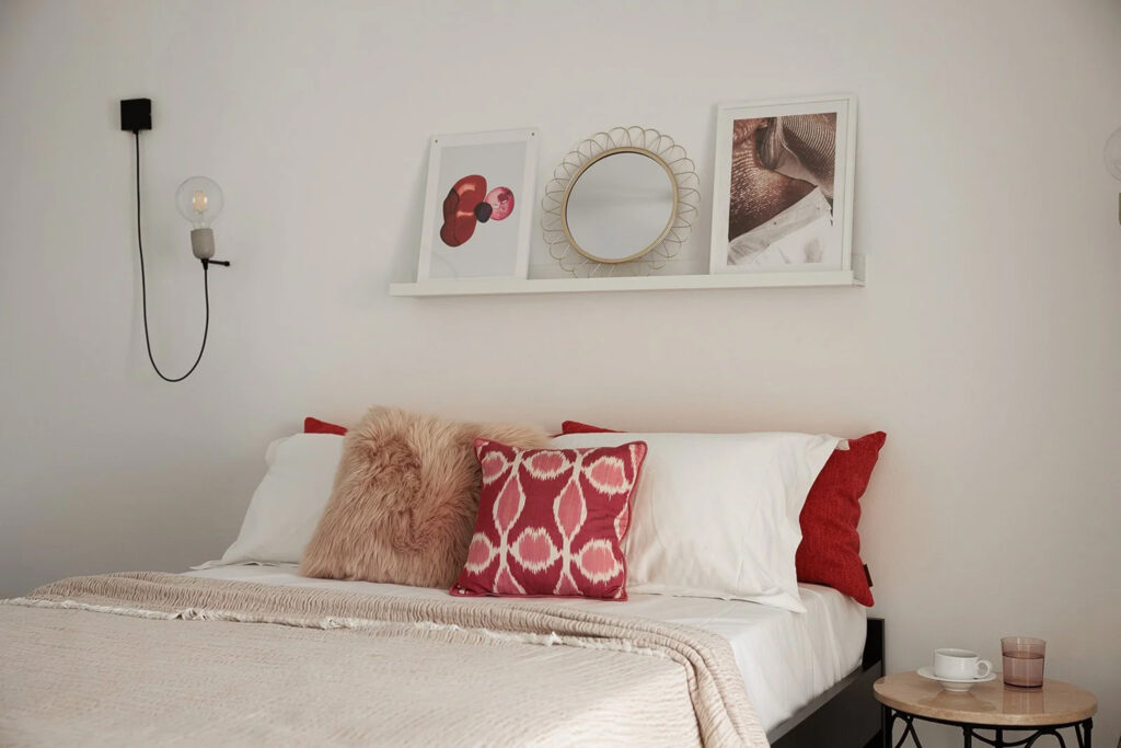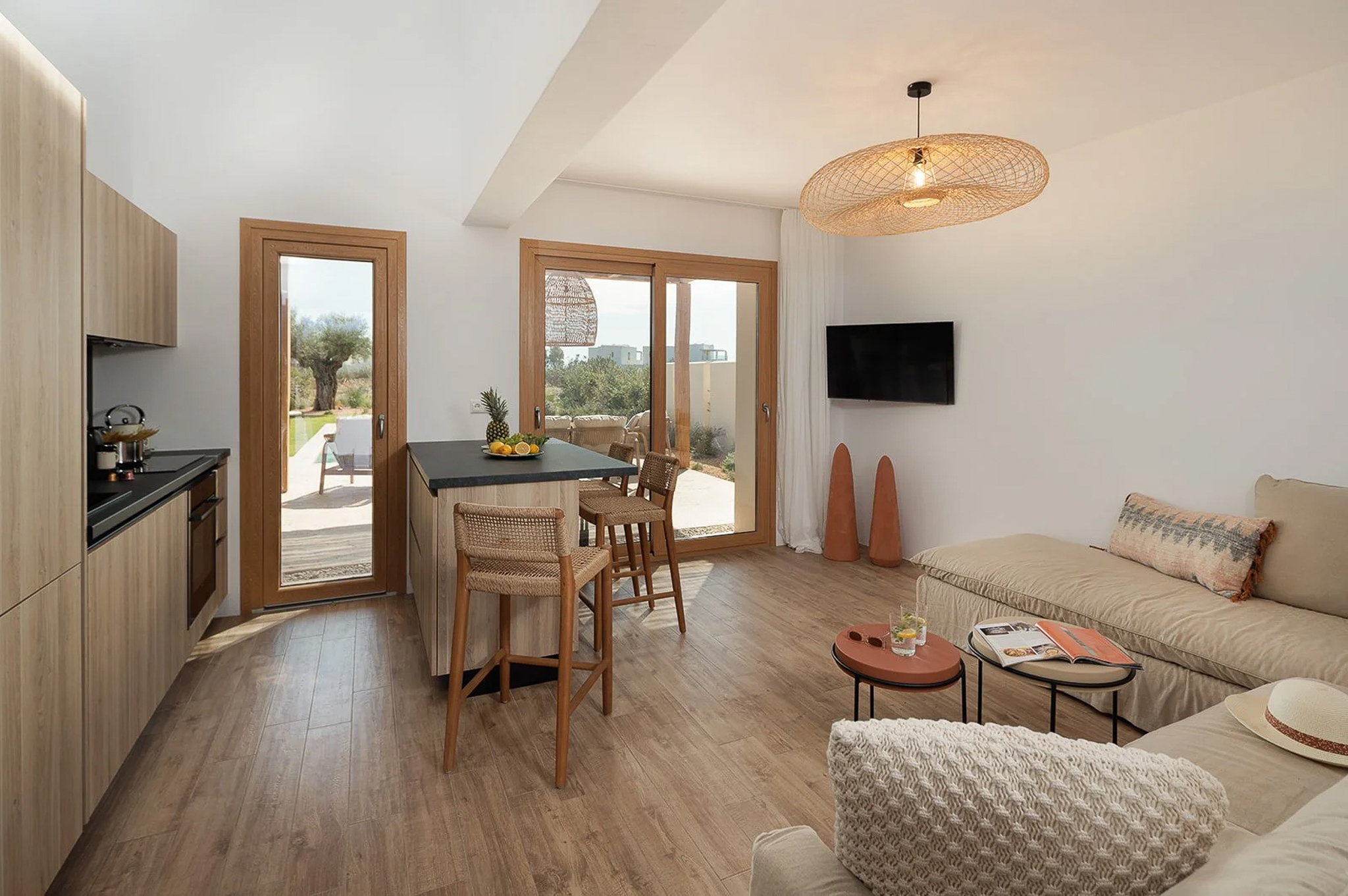 The main level offers an open plan living space with a sophisticated indoor seating area featuring built in couches, seamlessly connected to a modern fully equipped kitchen and an internal dining area with a large dining table. This level also includes an additional bedroom with a double bed and a fully sized double pull out mattress, along with a full bathroom. The living area flows effortlessly onto the outdoor pool and garden, blending indoor luxury with alfresco charm.
