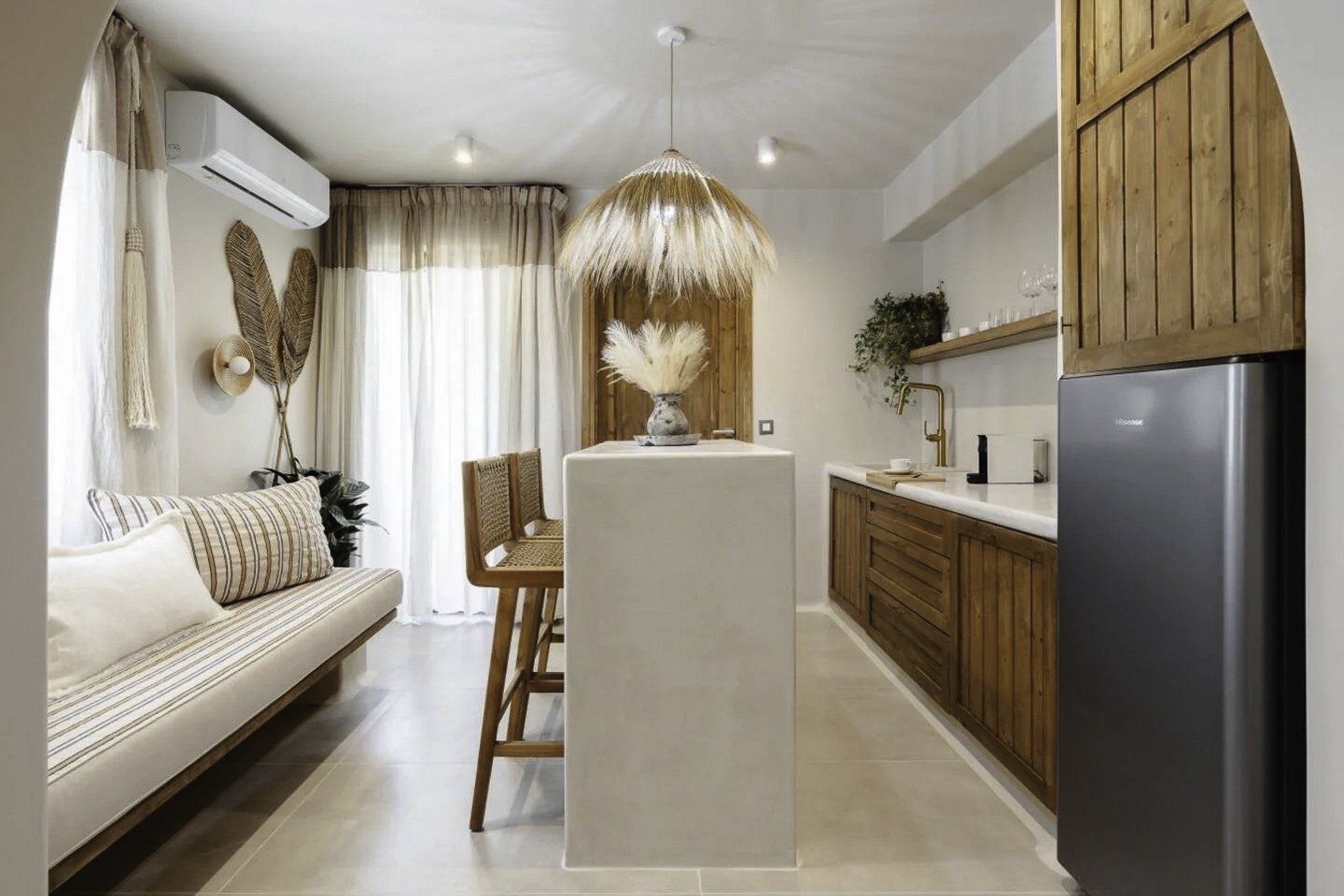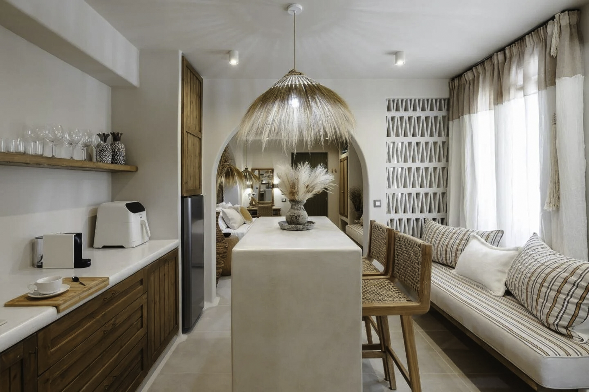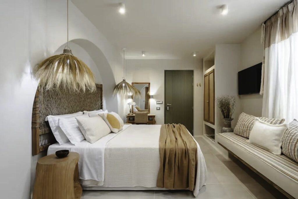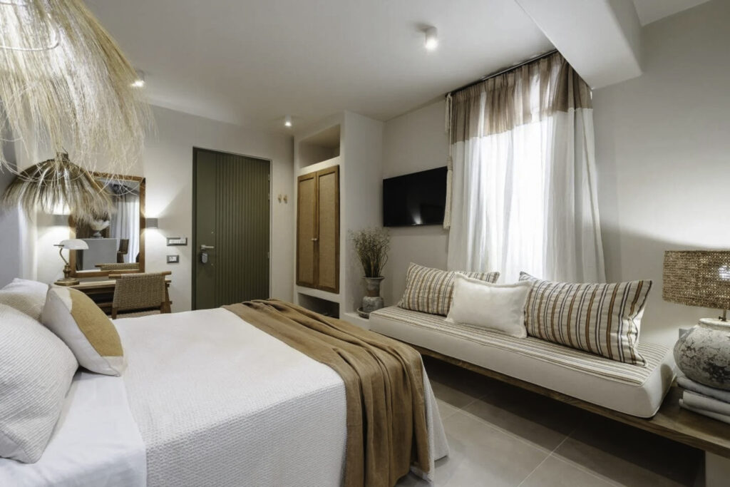 Each modern space blends chic design with Cycladic charm, featuring a cozy bedroom, contemporary bathroom, and fully-equipped kitchen. Enjoy the convenience of nearby restaurants and shops, all within walking distance. Relax in your bohemian-inspired retreat, designed for comfort and style. Experience the enchanting beauty of Naxos