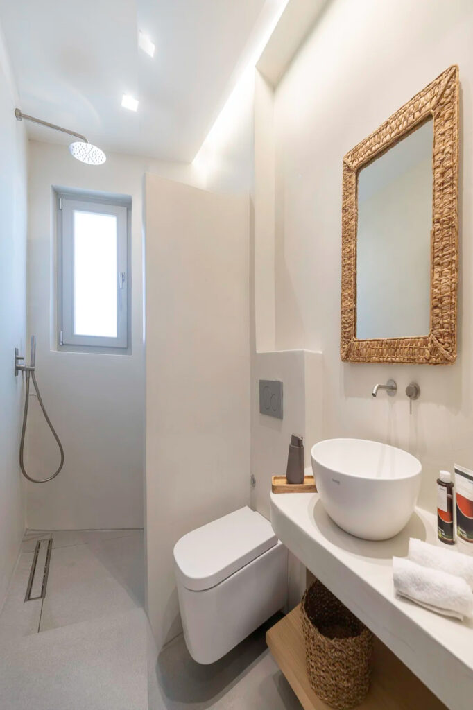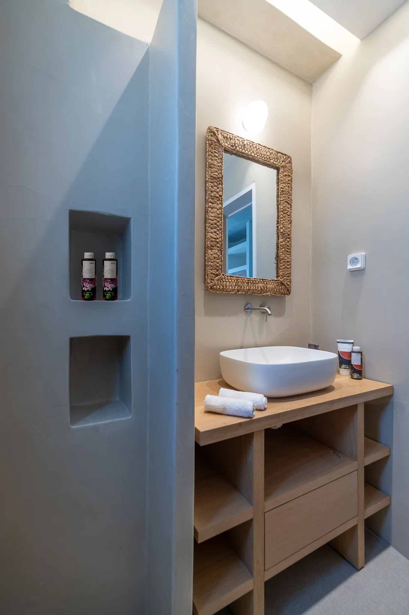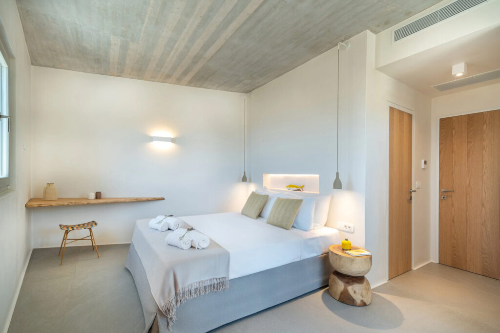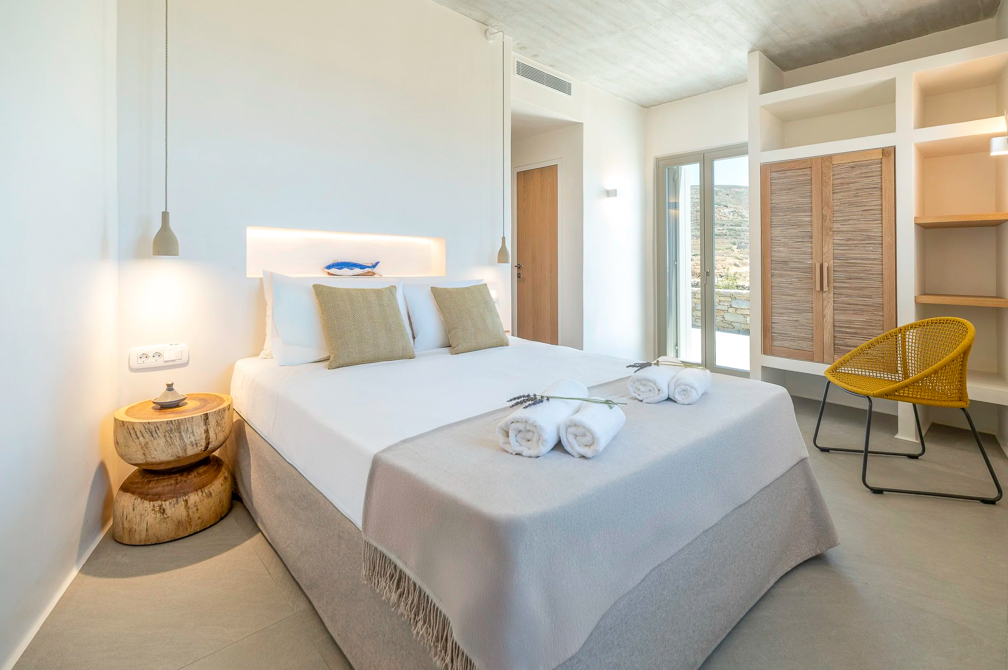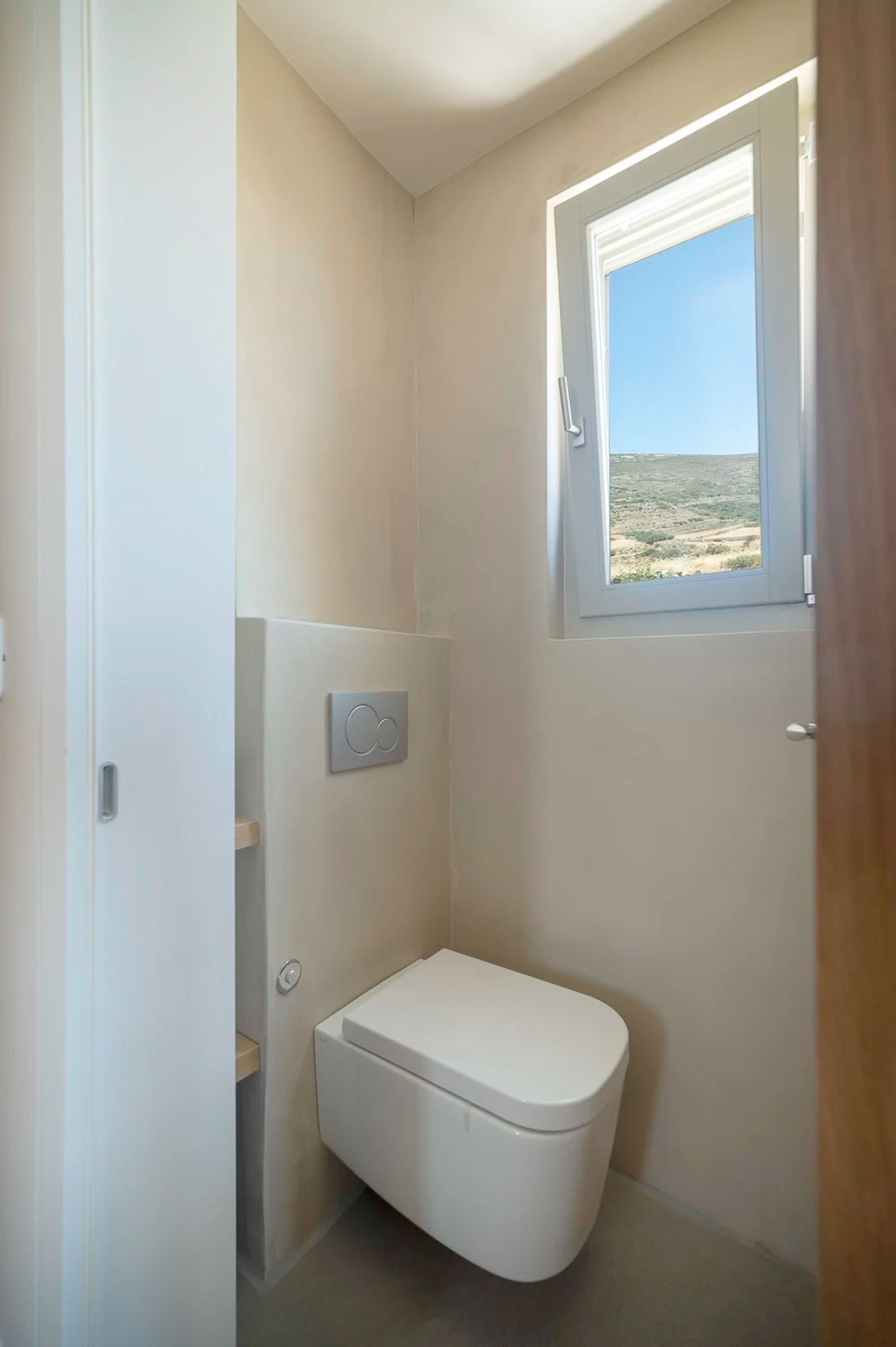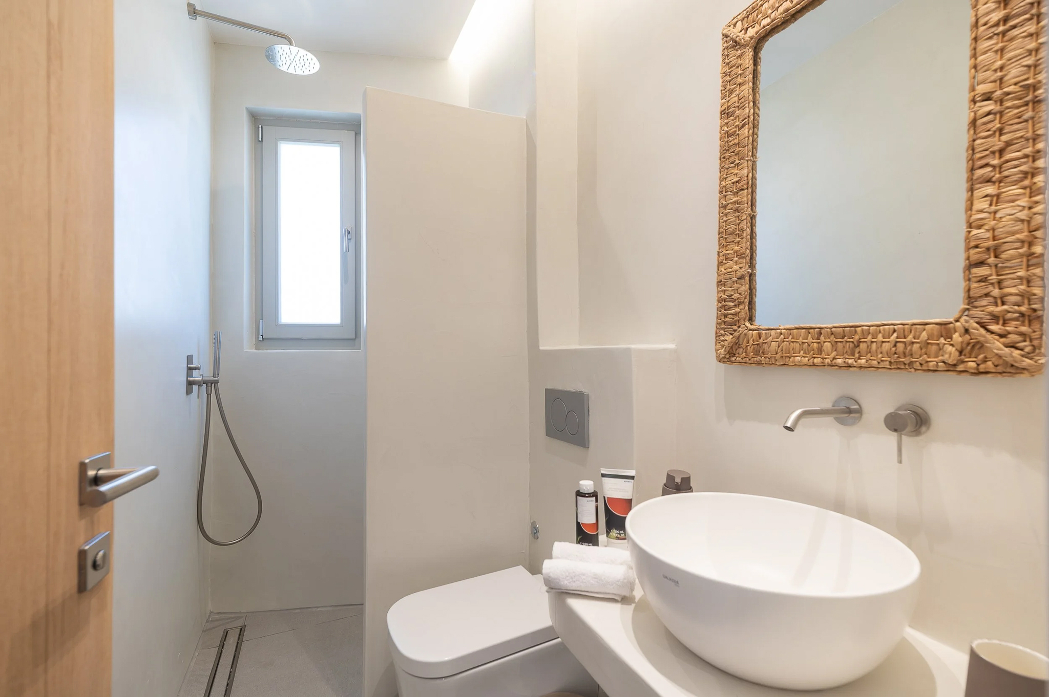 Salt N Sky is a state of the art two bedroom villa designed with contemporary elegance and uninterrupted sea views. Both bedrooms feature ensuite bathrooms with shower, toilet, and full facilities, while expansive openings frame panoramic views of the private pool and the Aegean beyond. Each bedroom enjoys a direct outlook toward the sea and sunset, creating a calm and elevated coastal atmosphere.