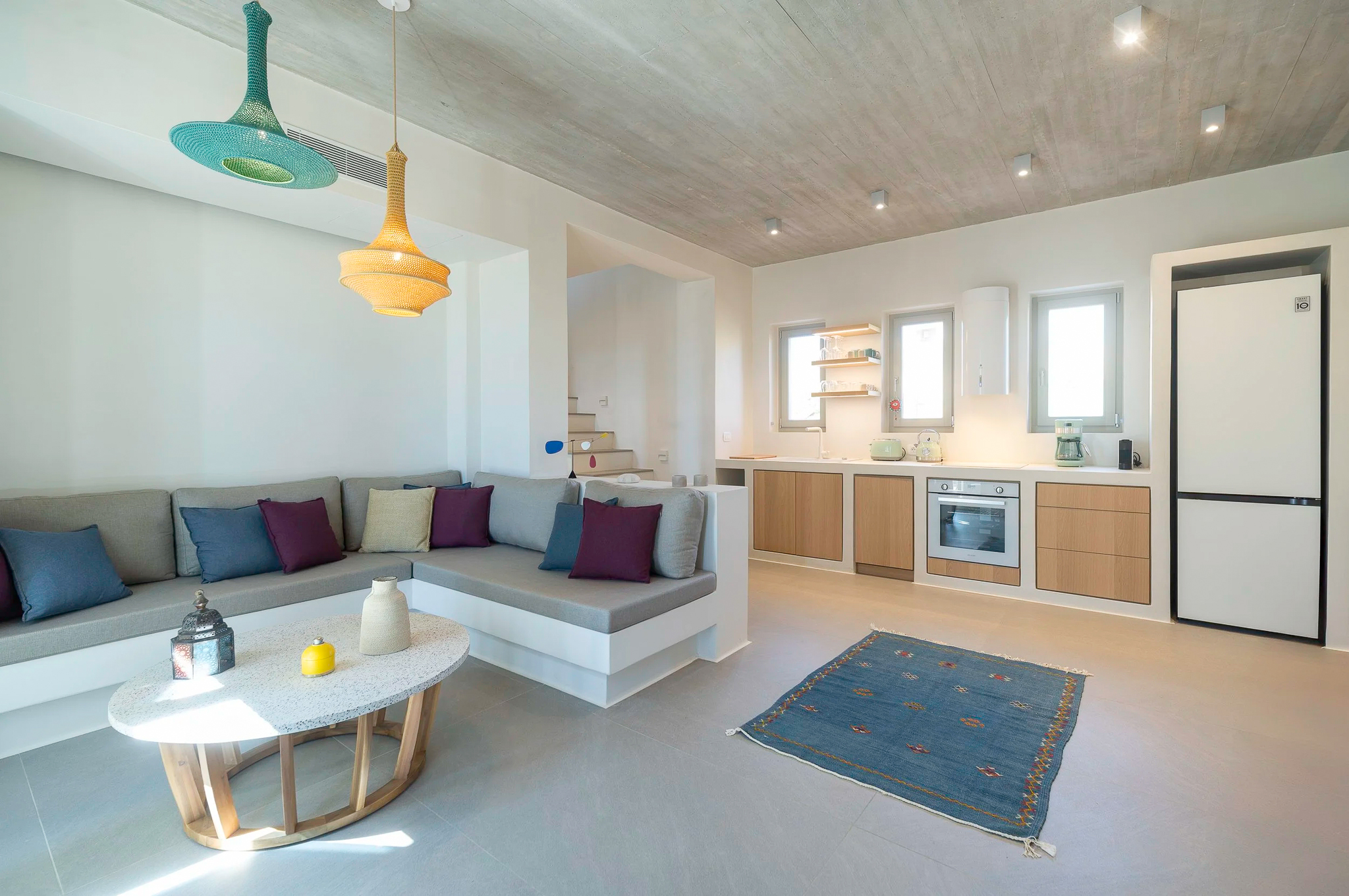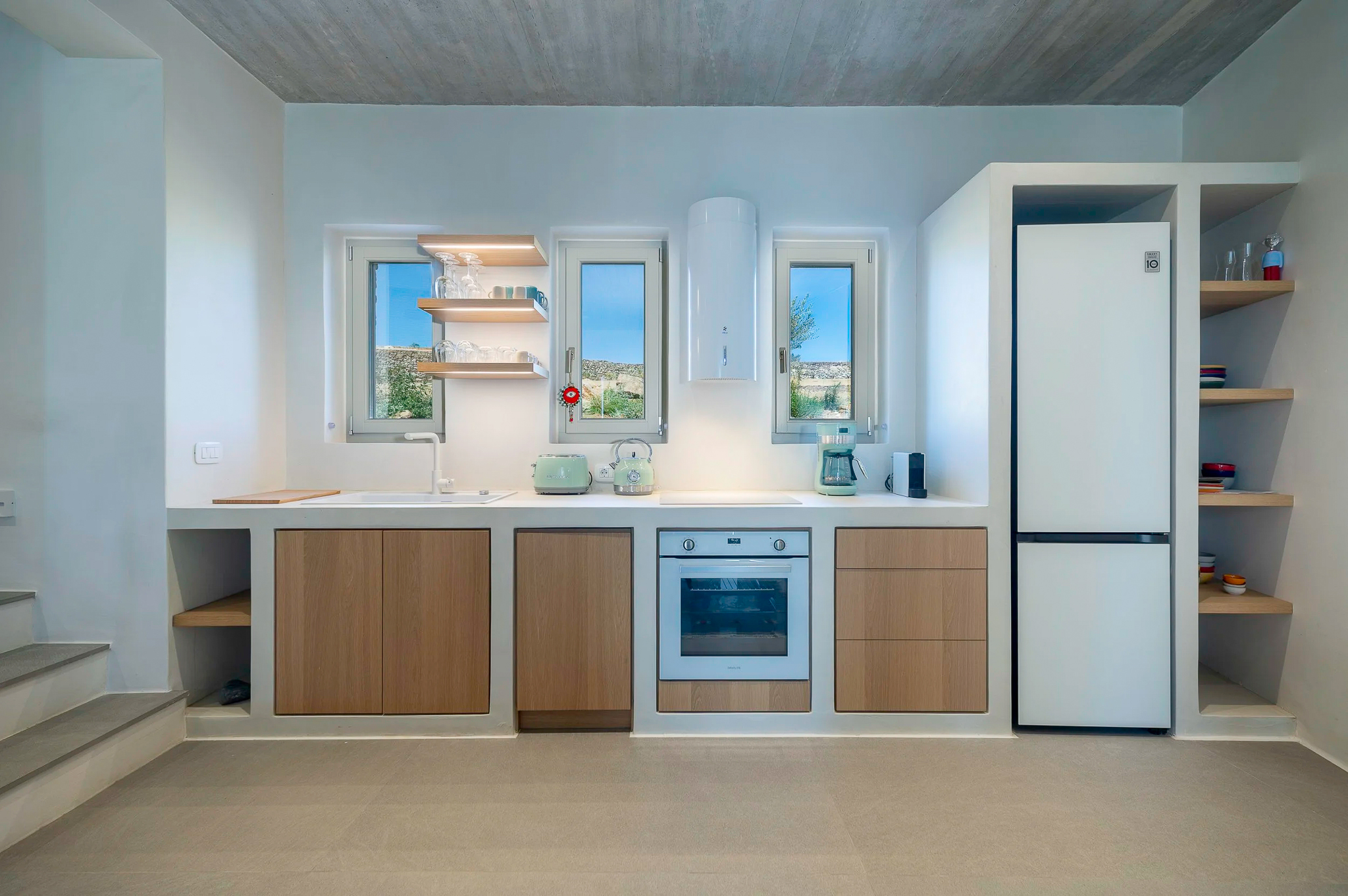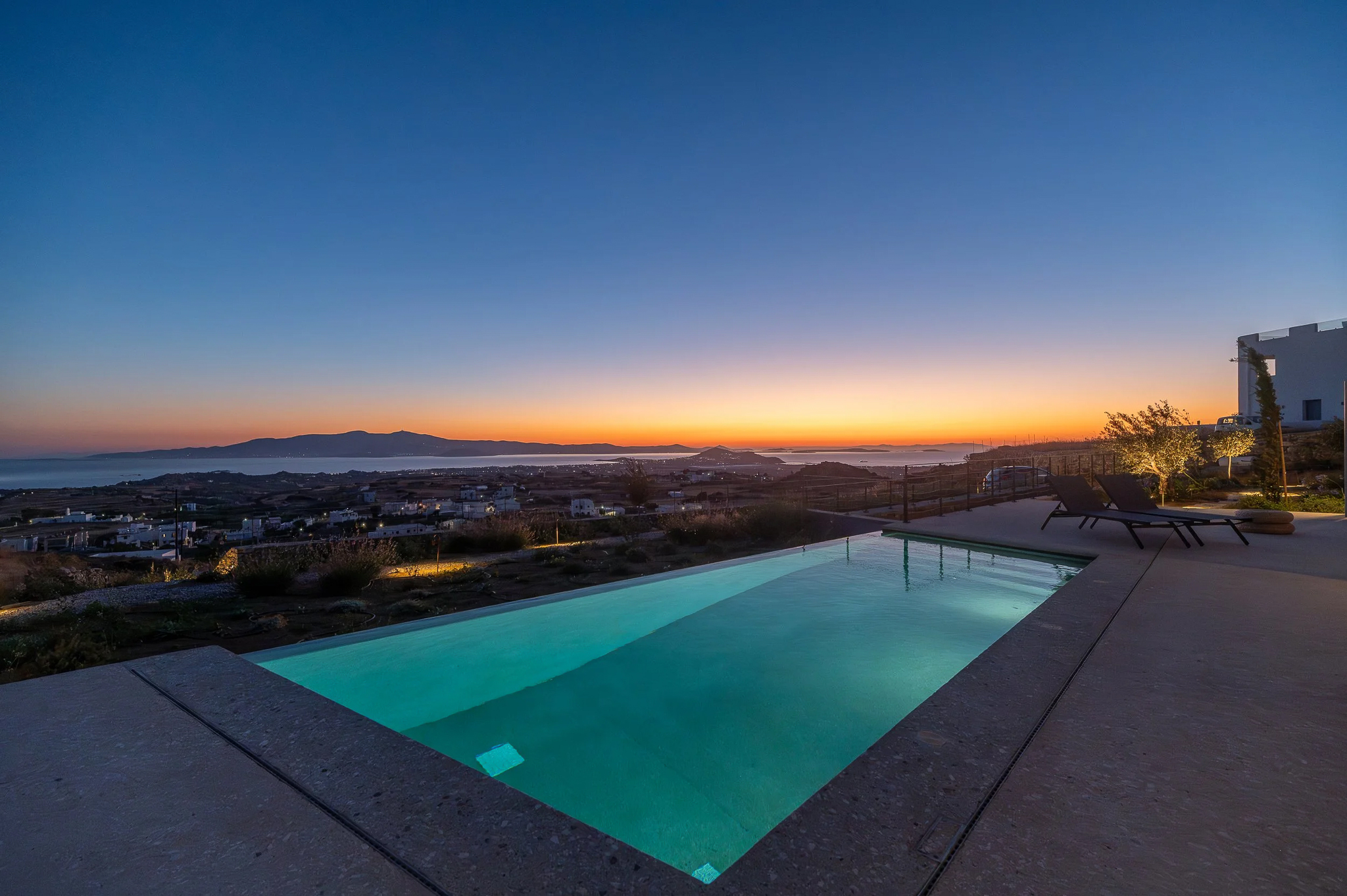 Outdoors, the villa offers a private swimming pool surrounded by sun loungers, a fully equipped outdoor kitchenette, barbecue area, and an elegant outdoor dining space ideal for entertaining. Designed for comfort, privacy, and effortless island living, the outdoor areas provide the perfect setting to enjoy the stunning sunsets and open landscapes.