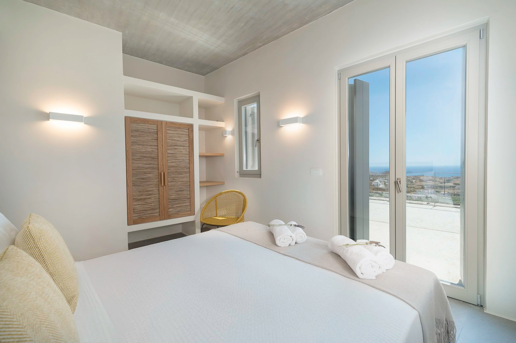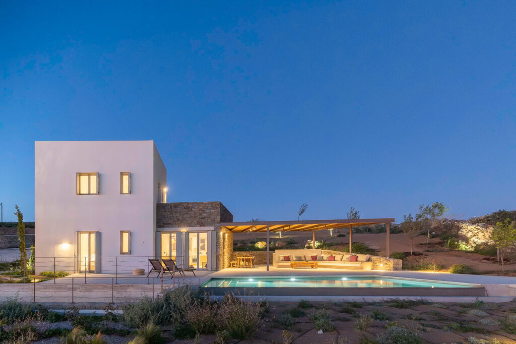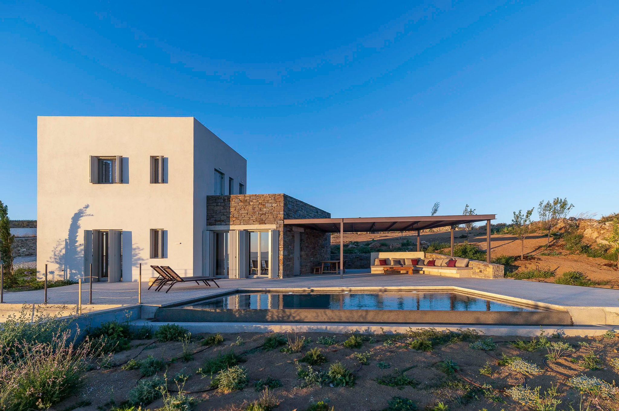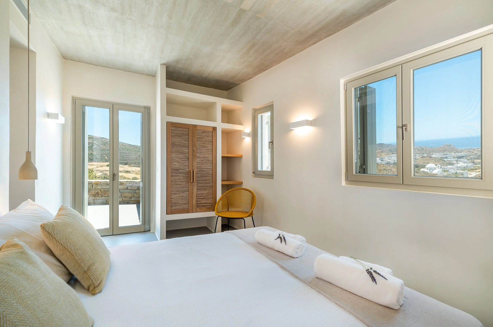 Outdoors, the villa offers a private swimming pool surrounded by sun loungers, a fully equipped outdoor kitchenette, barbecue area, and an elegant outdoor dining space ideal for entertaining. Designed for comfort, privacy, and effortless island living, the outdoor areas provide the perfect setting to enjoy the stunning sunsets and open landscapes.