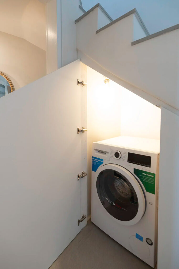 At the heart of the villa is a spacious open plan living area, where a fully equipped modern kitchen flows seamlessly into the lounge space, all oriented toward the pool and breathtaking views. Natural light enhances the refined interior, while a dedicated laundry room adds practicality to the thoughtfully designed layout.